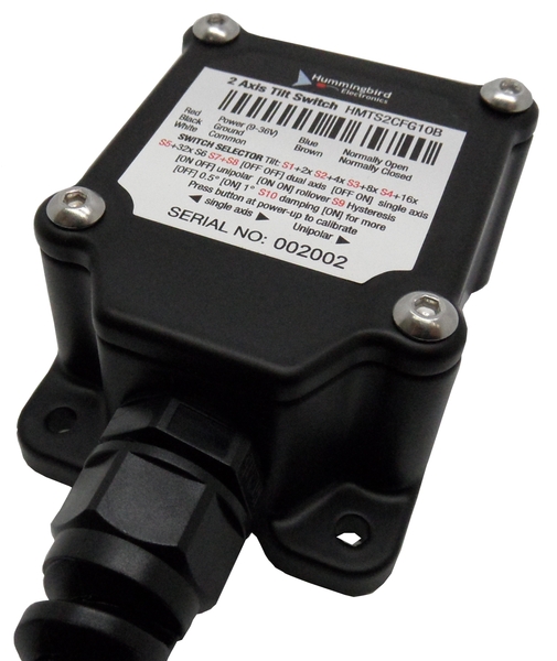 Hummingbird Electronics’ two-axis tilt switch is a simple to configure, flexible tilt switch with a wide range of applications. The tilt-switch can be operated horizontally, vertically or upside down and can be configured for single or dual axis operation. The switch set-point is user configurable.