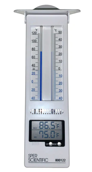 Digital thermometer with Min/Max feature allows you to display and record the minimum and maximum temperature values, allowing you to track extreme temperatures over a period of time. The dual analog thermometers provide quick current readings at a glance in both Celsius (°C) and Fahrenheit (°F).
