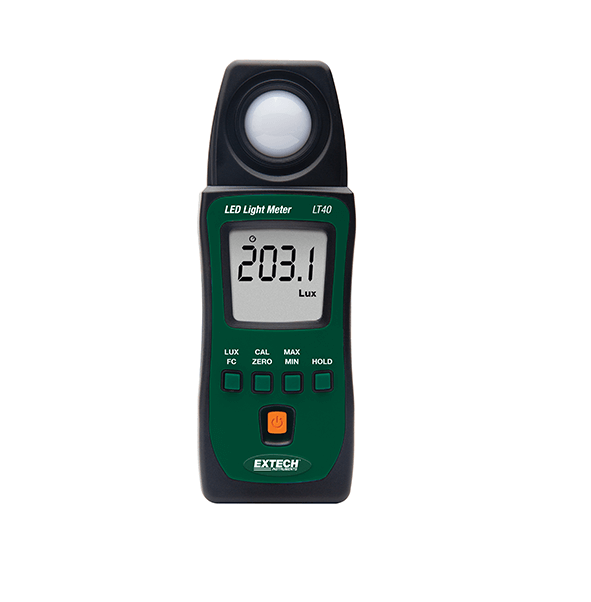The LT40 LED light meter is useful for measuring and optimizing environmental light levels in a wide range of environments, including office buildings, manufacturing plants and warehouses, university campuses, schools, hospitals, and many other locations. OSHA regulates workplace lighting because illumination must be adequate for assigned tasks, and light meters are used to verify regulatory compliance, as well as state and local public safety codes and ordinances. Use of LED lighting is on the rise because it is more efficient to operate, it emits stable, high quality illumination, and the technology is dropping in price. Besides LED lighting, the LT40 can measure standard light sources fluorescent, metal halide, high pressure sodium and incandescent up to 400,000 lux (40,000 Fc). The LT40 comes with a built-in sensor with protective cover, 2 AAA batteries, storage pouch, and user manual.