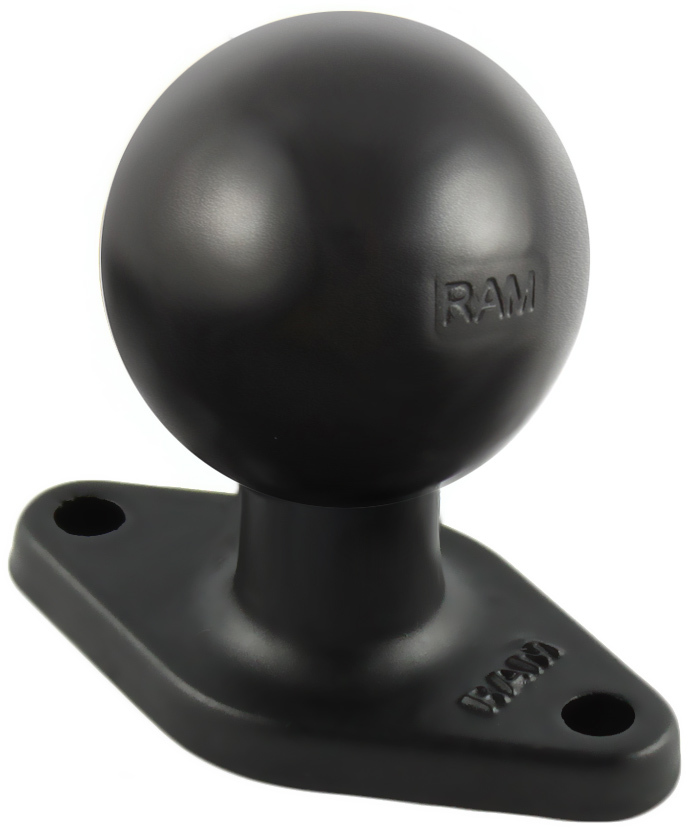 The RAM-238U consists of a 1.5″ diameter rubber ball connected at right angles to a 2.43″ x 1.31″ diamond base. The base has two holes 1.912″ from center to center, matches the industry standard AMPS hole pattern and will connect to a large variety of RAM Mount and third party cradles.